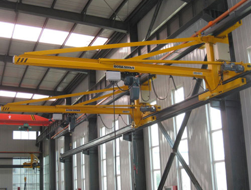 這種懸臂吊適用于多工位流水作業(yè),不需要地面空間,利用安裝在墻壁上的軌道,沿軌道運行以實現(xiàn)多個工位的工件吊卸。減少工位對車間大型橋式起重機的依賴,減少等待時間提高工作效率。